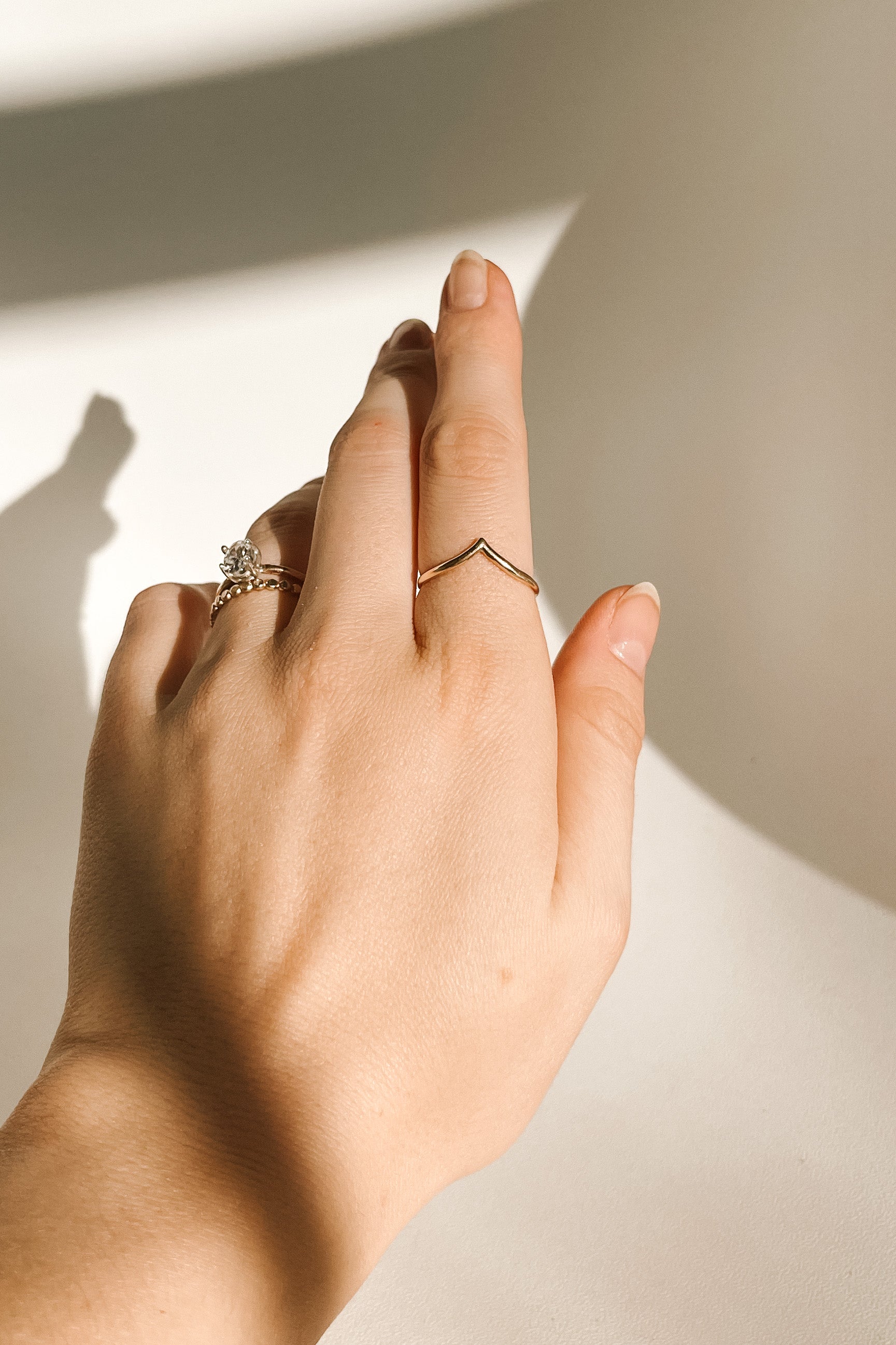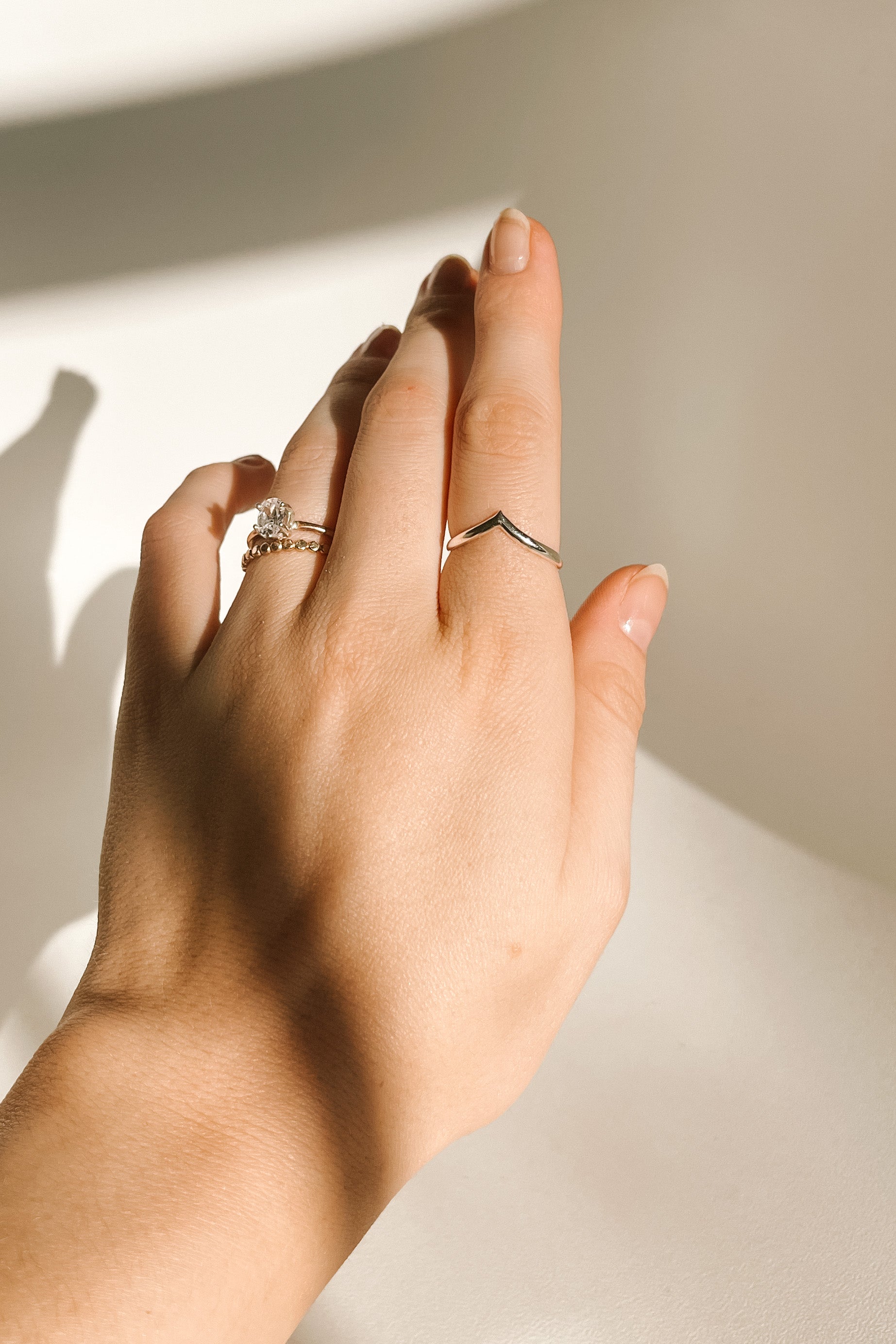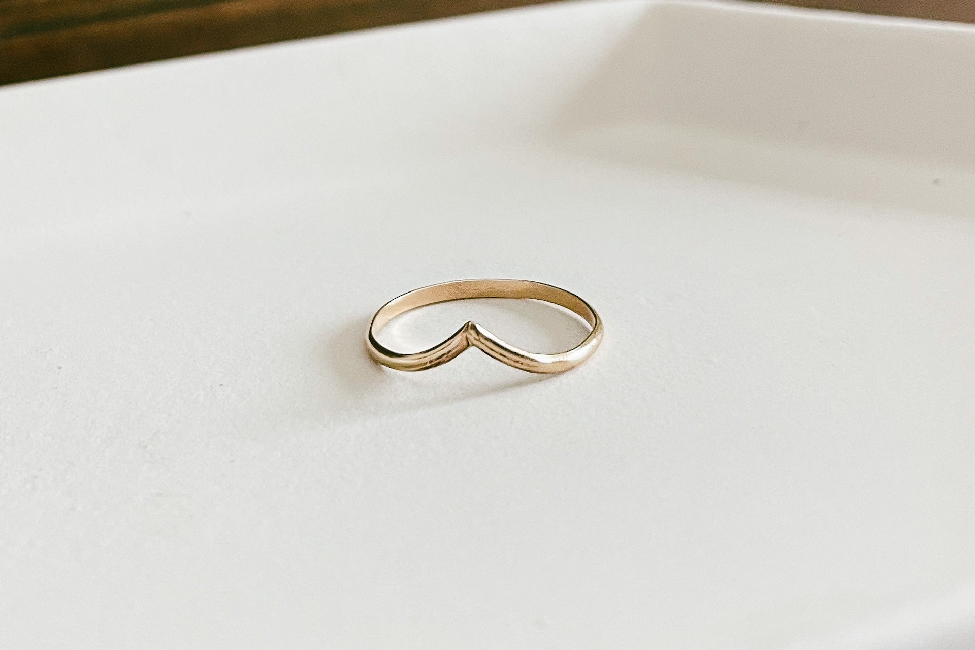 Piper is a chevron shaped ring made from a half round wire. It can be worn by itself or add it to any ring stack to create a custom design.