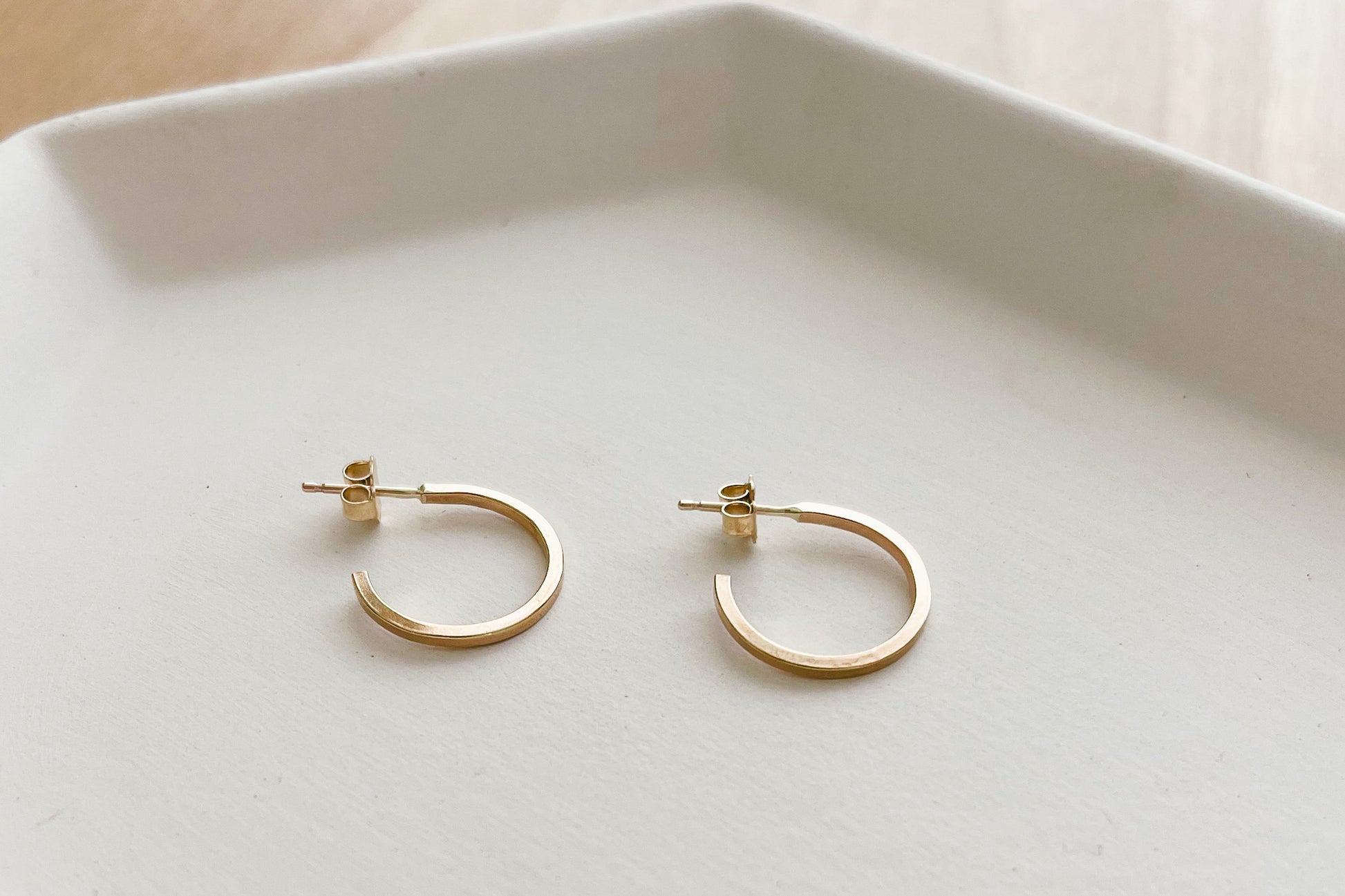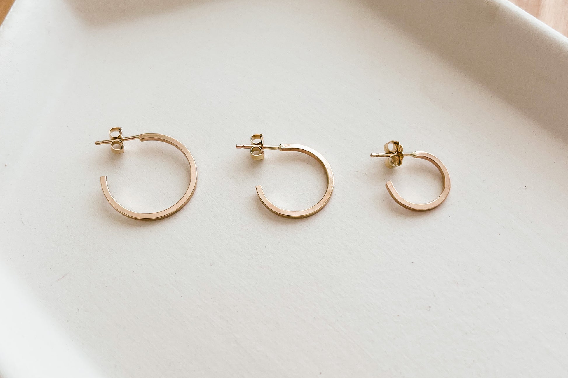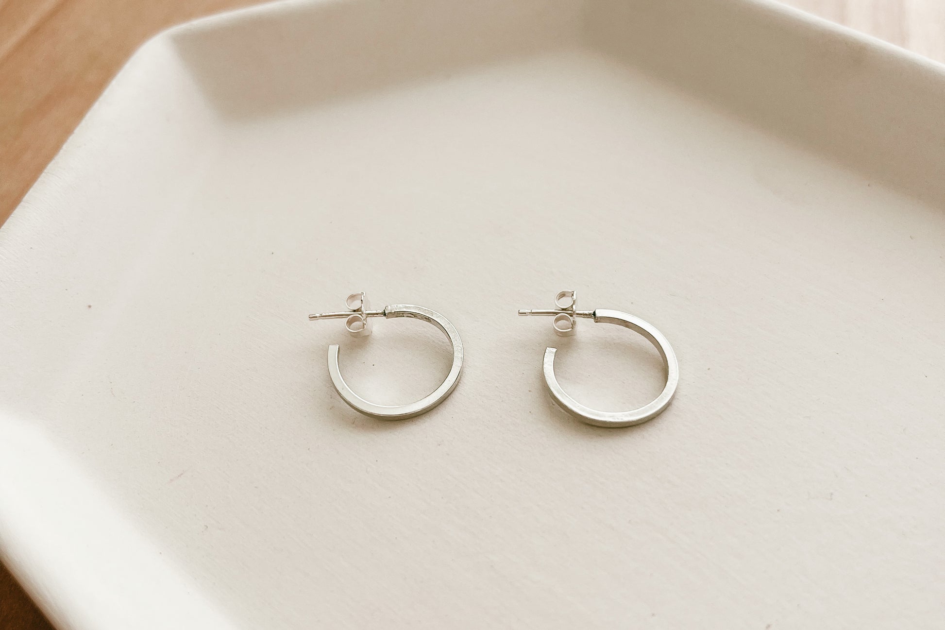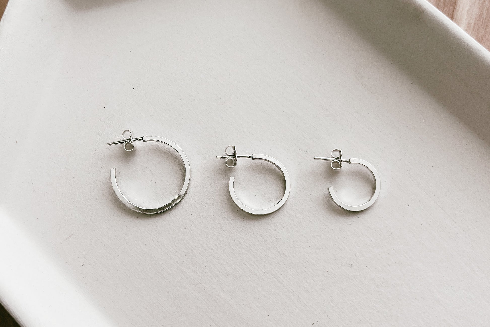 The Glenn hoop earrings are made from a square wire. They are super comfortable and give an edge to a classic hoop. Available in 3 different sizes.